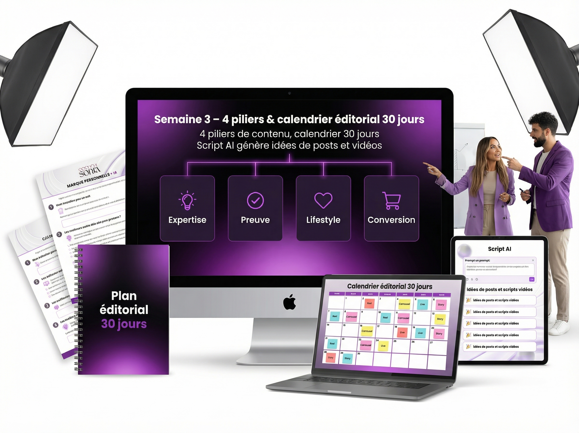On fixe tes 4 piliers de contenu (expertise, preuve, lifestyle, conversion), on bâtit ton calendrier éditorial 30 jours et Script AI génère tes premières idées de posts et de scripts vidéos.