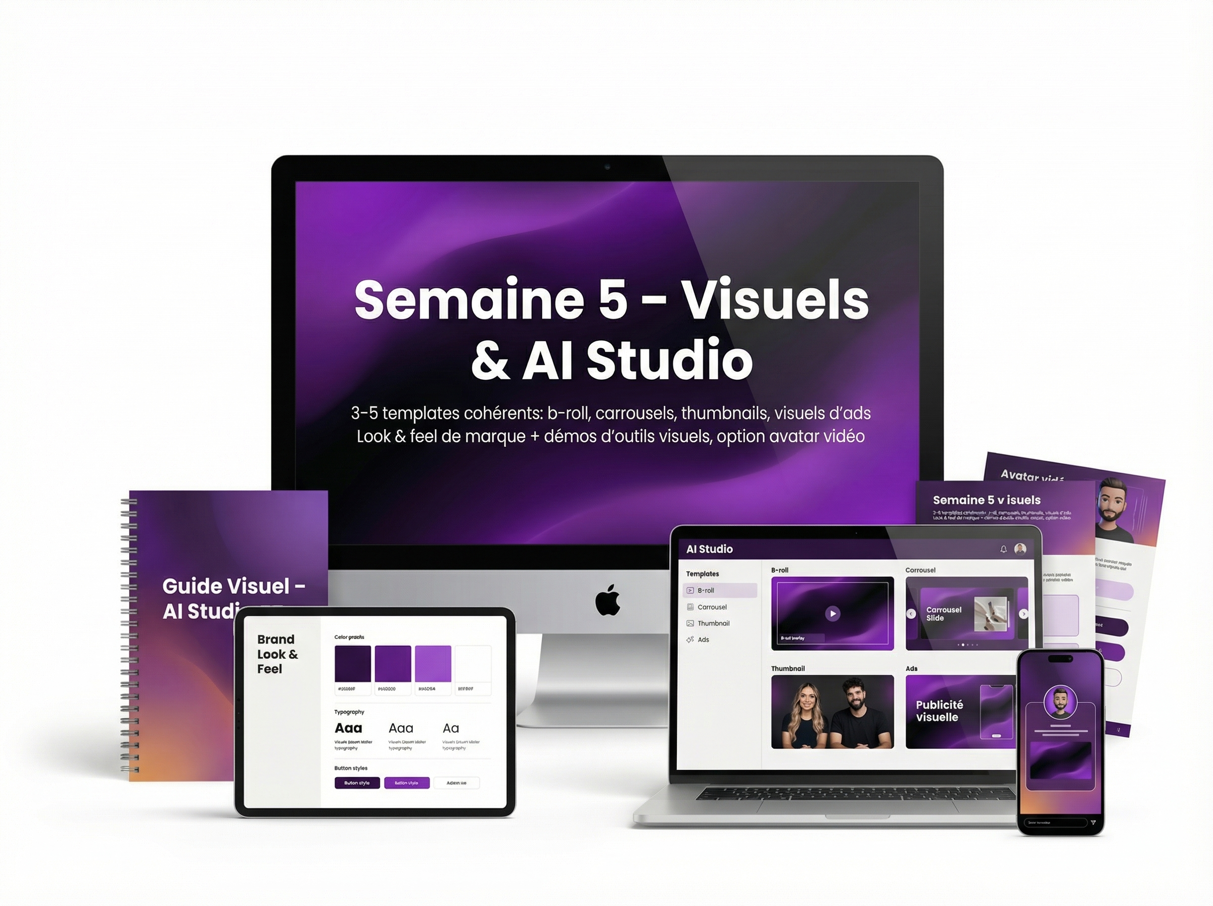 Tu crées ton AI Studio visuel : 3–5 templates cohérents (b-roll, carrousels, thumbnails, visuels d’ads) et un look & feel de marque, avec démos d’outils visuels et option avatar vidéo pour aller plus loin.