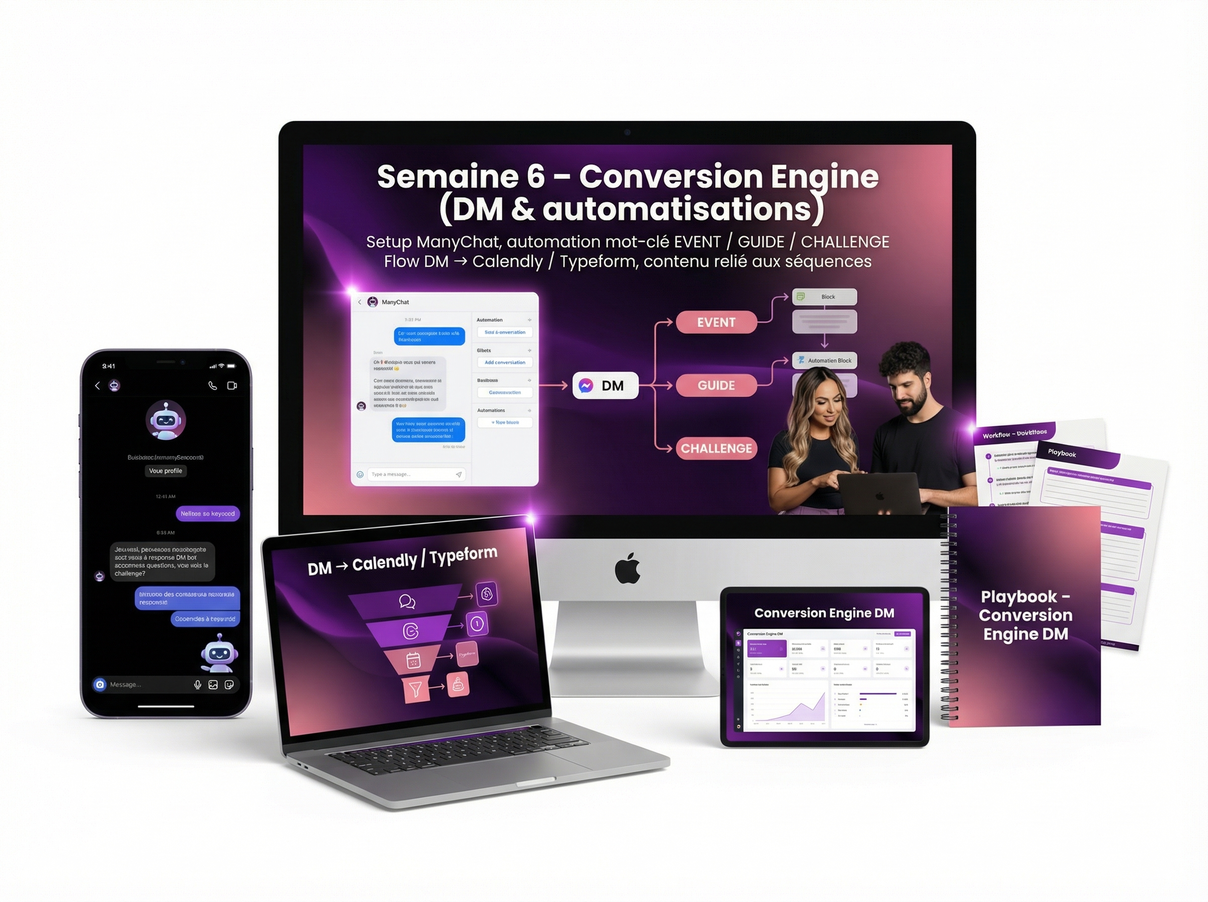 On installe ton Conversion Engine DM : setup, création d’une automation mot-clé (EVENT/GUIDE/CHALLENGE) et d’un flow DM à Calendly/Typeform, puis connexion directe entre ton contenu et ces séquences.