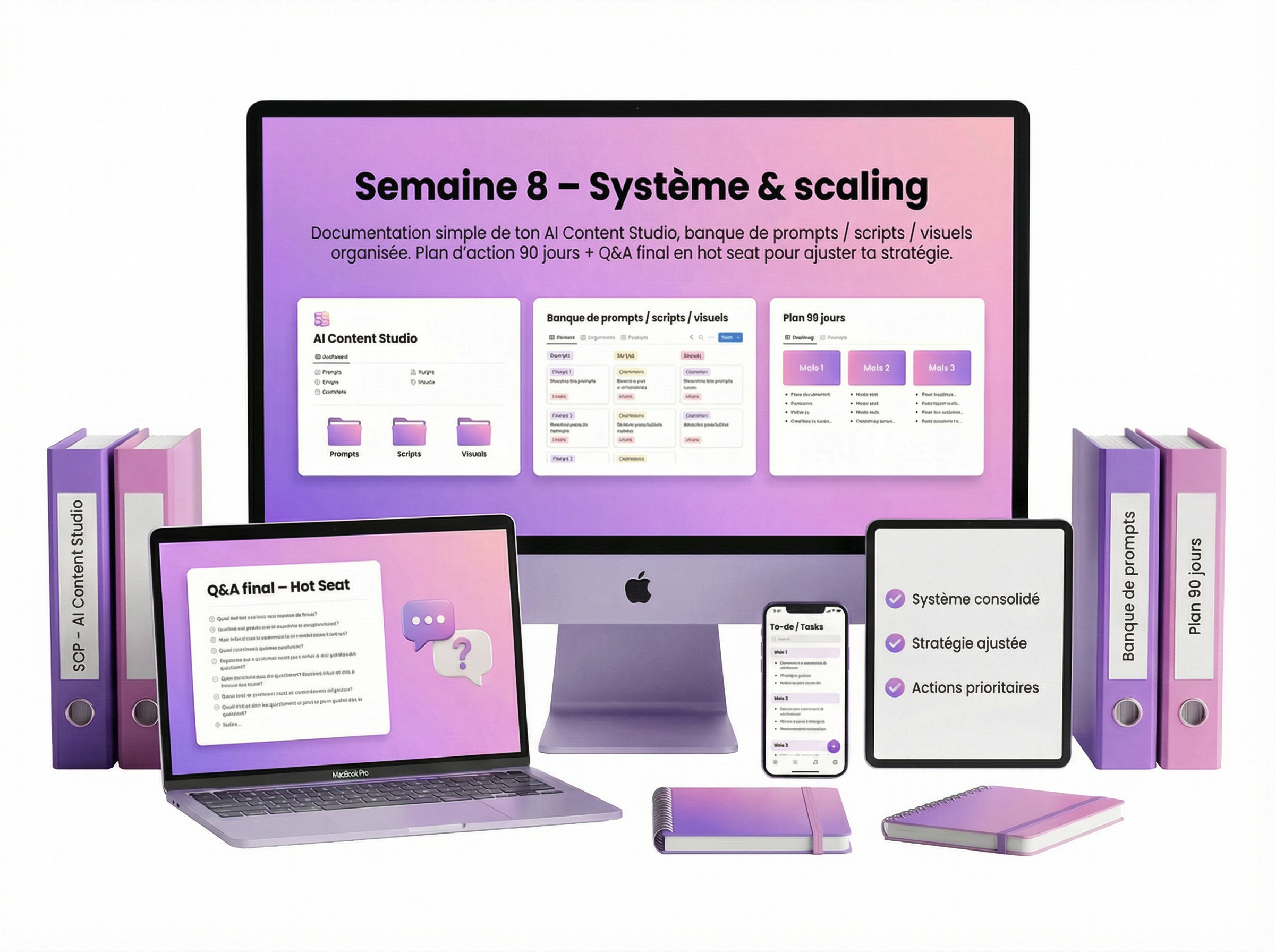 On consolide ton système : documentation simple de TON AI Content Studio, organisation de ta banque de prompts/scripts/visuels, plan d’action 90 jours et Q&A final en hot seat pour ajuster ta stratégie personnelle.